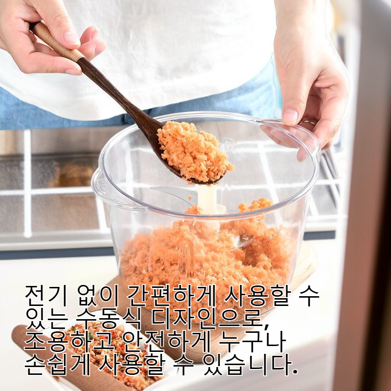 ● 손으로 직접 조작하는 아기 이유식 조리기로, 육류와 채소, 마늘까지 손쉽게 다질 수 있어 건강한 집밥 준비에 최적화되어 있습니다.